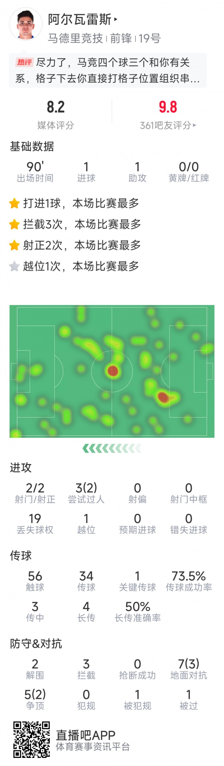 阿爾瓦雷斯本場(chǎng)數(shù)據(jù):傳射建功,2次射門(mén)均射正,3次攔截