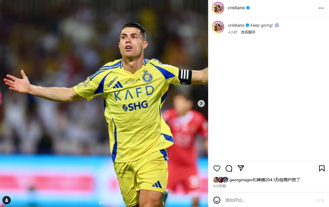 2月26日訊 在今天凌晨結束的沙特聯(lián)賽中,利雅得勝利在客場2-0戰(zhàn)勝了麥加統(tǒng)一。C羅賽后在社媒上曬出了自己的比賽照片,并配文“繼續(xù)努力”。
