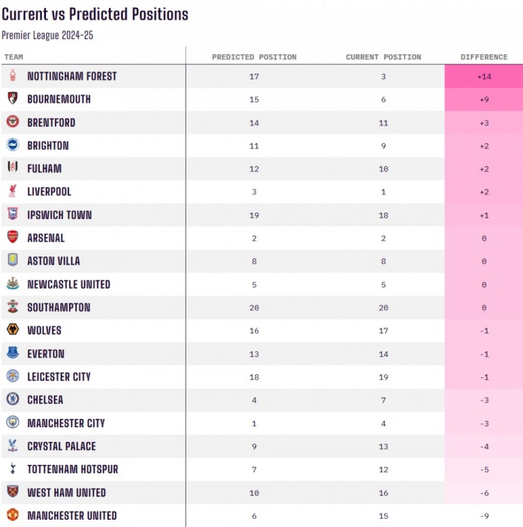 當(dāng)前排名對比賽季初預(yù)測排名:諾丁漢森林+14最佳,曼聯(lián)-9最差