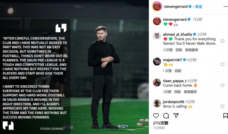 杰拉德社媒告別信:解約決定并不容易,沙特足球走在正確的道路上