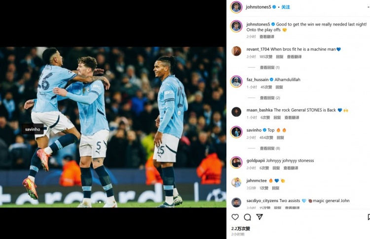 1月30日訊 曼城在本輪歐冠3-1逆轉(zhuǎn)布魯日,成功晉級(jí)附加賽,送出2次助攻的斯通斯也通過(guò)社媒紀(jì)念勝利。