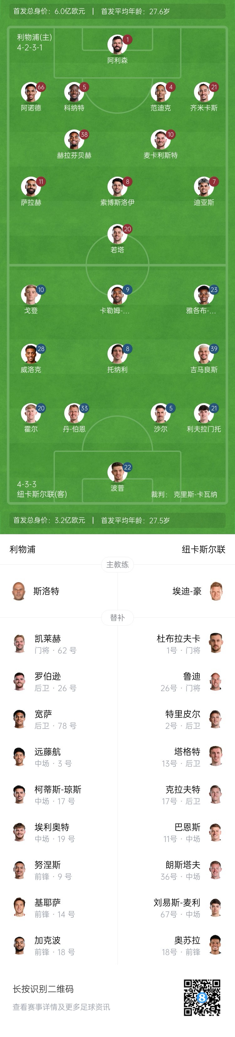 利物浦首發(fā):1-阿利森、21-齊米卡斯、4-范迪克、5-科納特、66-阿諾德、38-赫拉芬貝赫、8-索博斯洛伊、10-麥卡利斯特、7-迪亞斯、11-薩拉赫、20-若塔
