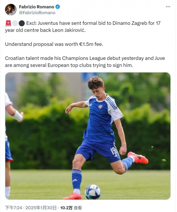 1月30日訊 據意大利記者羅馬諾透露,尤文150萬歐報價薩格勒布迪納摩17歲中衛(wèi)亞基羅維奇。