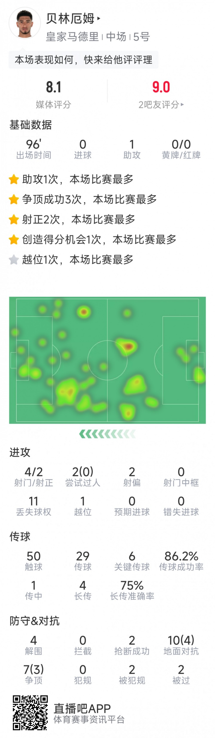 2月27日訊 在國王杯半決賽,皇馬1-0擊敗皇家社會,,貝林厄姆送出助攻,以下為他在本場數(shù)據(jù):