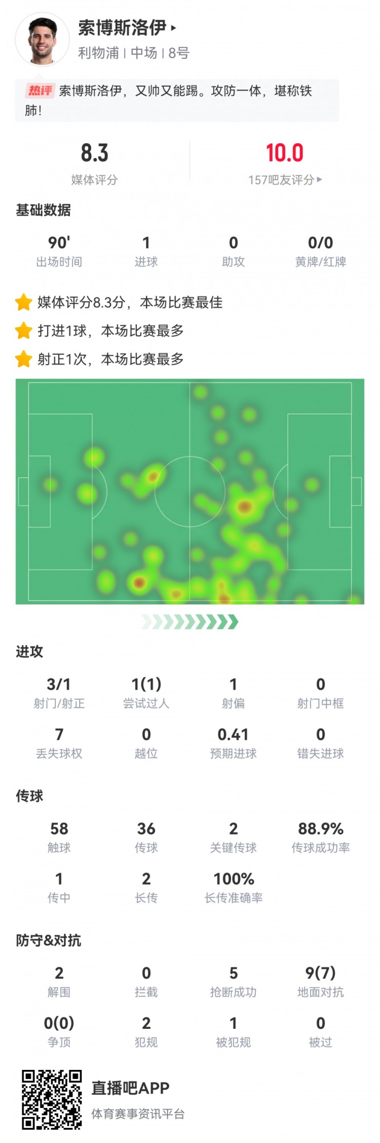2月27日訊 本輪英超,利物浦2-0紐卡斯?fàn)?。此役索博斯洛伊首發(fā)打滿全場發(fā)揮出色,球員全場重點(diǎn)數(shù)據(jù)如下↓
