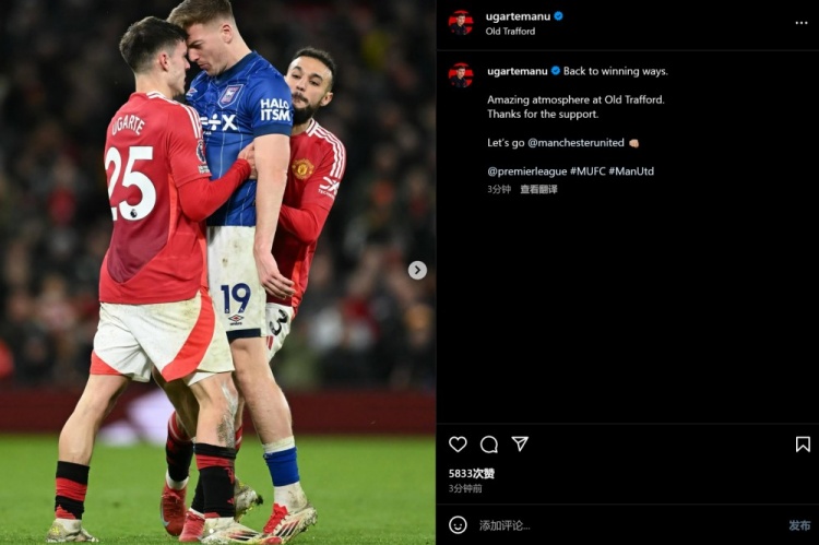 2月27日訊 本輪英超比賽中,十人作戰(zhàn)的曼聯(lián)3-2逆轉(zhuǎn)擊敗伊普斯維奇。賽后,烏加特更新社媒慶祝勝利。