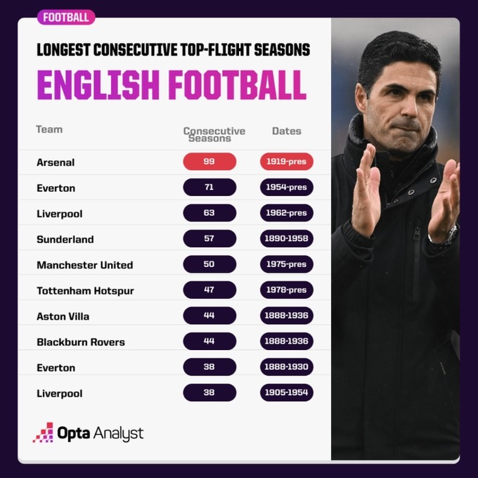 OPTA統(tǒng)計(jì)表明,拿到這1分之后,阿森納本賽季拿到的積分已經(jīng)確定他們不會(huì)降級(jí)了,這意味著阿森納將連續(xù)100個(gè)賽季征戰(zhàn)英格蘭頂級(jí)聯(lián)賽。