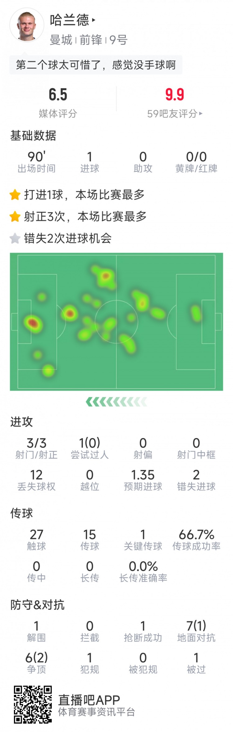 2月27日訊 在本輪英超,曼城1-0擊敗熱刺,哈蘭德破門。以下為他在本場數(shù)據(jù):