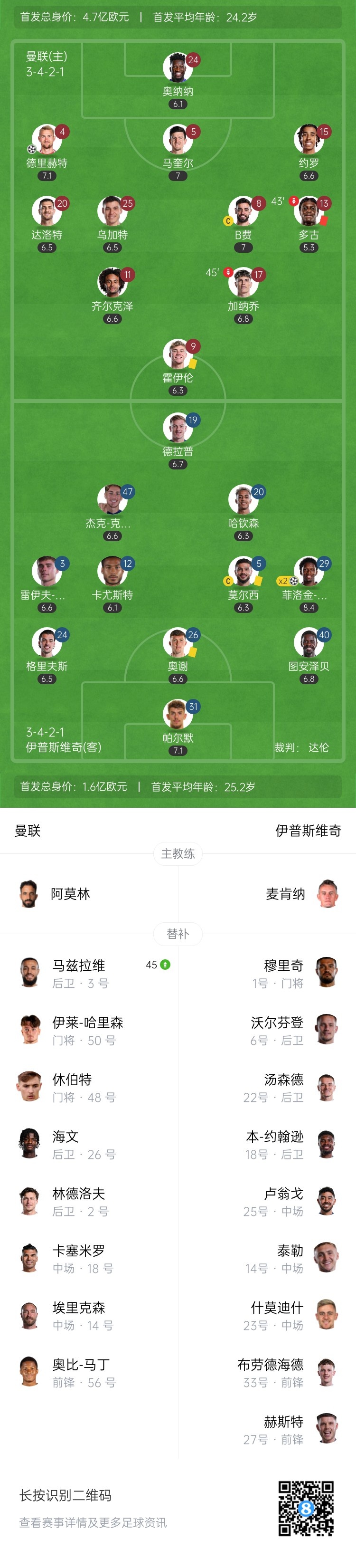 第4分鐘,曼聯(lián)后場(chǎng)重大失誤!奧納納出擊,多古回傳送空門大禮!菲洛金輕松打進(jìn)空門!曼聯(lián)0-1落后伊普斯維奇↓