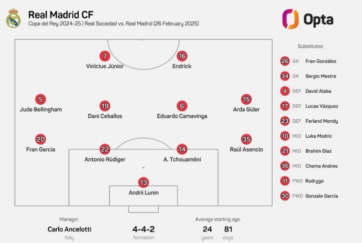2月27日訊 國王杯半決賽首回合皇馬對陣皇家社會(huì)的比賽即將開始,雙方首發(fā)陣容公布。