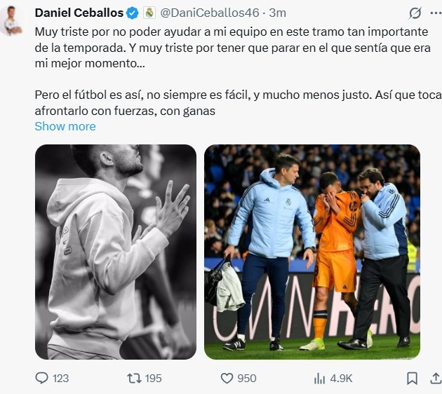 這還沒有結束,我經歷過更糟的,感謝你們的愛?;仡^見,我會比你們想象的更快復出。????皇馬加油!”