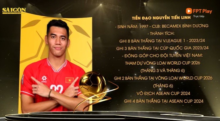 當(dāng)?shù)貢r間26日晚間在胡志明市舉辦的越南足球2024年頒獎典禮上,阮進靈首次贏得了越南足球男子金球獎。