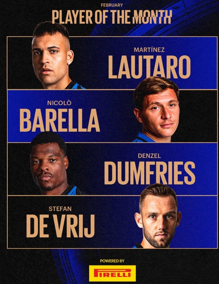 2月27日訊 國米官方評選出二月份隊內(nèi)最佳球員候選名單,勞塔羅、巴雷拉等人在列,具體如下: