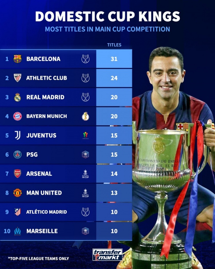 德轉(zhuǎn)列五大聯(lián)賽國(guó)內(nèi)杯賽奪冠榜:巴薩31次第1,畢巴24次第2