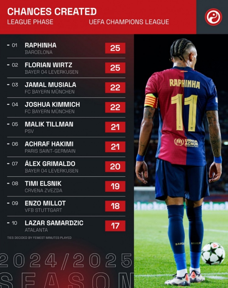 歐冠聯(lián)賽階段造機(jī)會(huì)榜:拉菲、維爾茨25次第1,穆西亞拉基米希第2