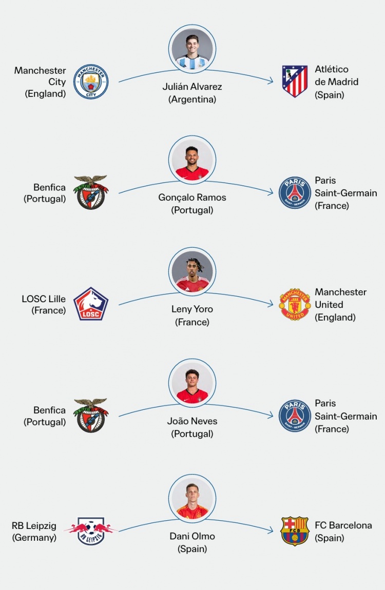 1月31日訊 國際足聯(lián)統(tǒng)計了2024年轉(zhuǎn)會費最高的5筆引援,其中,阿爾瓦雷斯成為年度標(biāo)王。