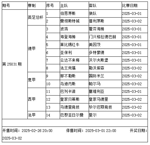 本周末,英超因?yàn)樽憧偙鴷和?。下周中又將有歐戰(zhàn)各級(jí)賽事淘汰賽,強(qiáng)隊(duì)紛紛面臨雙線(xiàn)作戰(zhàn)。傳足勝負(fù)彩第25031期涉及的球隊(duì)中,多特蒙德、勒沃庫(kù)森、皇家馬德里、巴塞羅那、巴黎圣日爾曼和里爾都要征戰(zhàn)歐冠淘汰賽;法蘭克福、畢爾巴鄂競(jìng)技征戰(zhàn)歐聯(lián)淘汰賽;皇家貝蒂斯將出戰(zhàn)歐協(xié)淘汰賽。