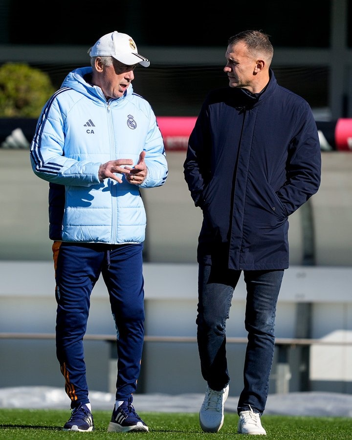 米蘭名宿舍甫琴科今天到皇馬訓練基地探班,皇馬官推曬出了他與恩師安切洛蒂聊天的照片。