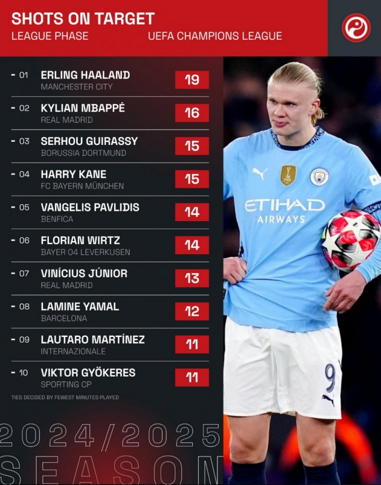 歐冠聯(lián)賽階段射正榜:哈蘭德19次居首,姆巴佩第2,凱恩吉拉西第3