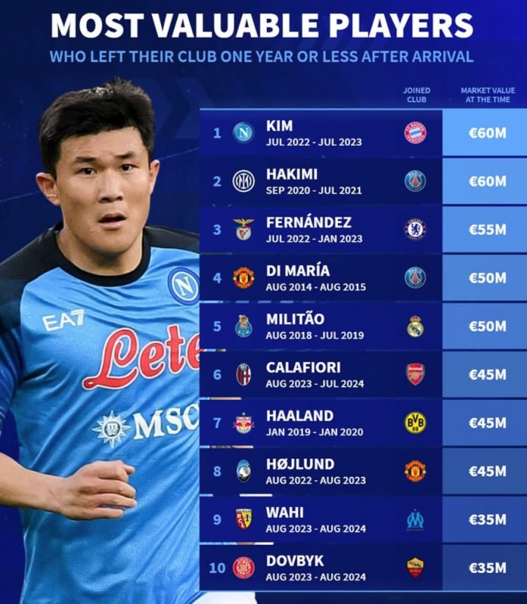 3月1日訊 《轉(zhuǎn)會(huì)市場(chǎng)》統(tǒng)計(jì)了加盟球隊(duì)一年內(nèi)便轉(zhuǎn)會(huì)離隊(duì)的球員身價(jià)最貴榜單,金玟哉和阿什拉夫并列居首。
