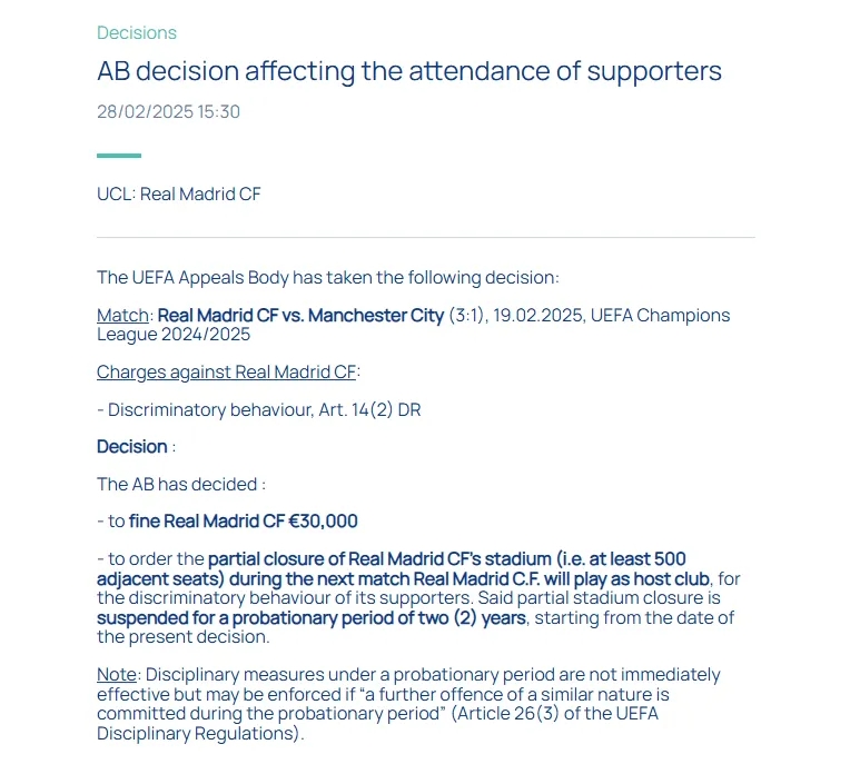 官方:因球迷歧視行為,皇馬被罰歐冠主場(chǎng)關(guān)閉部分看臺(tái)+罰款3萬歐