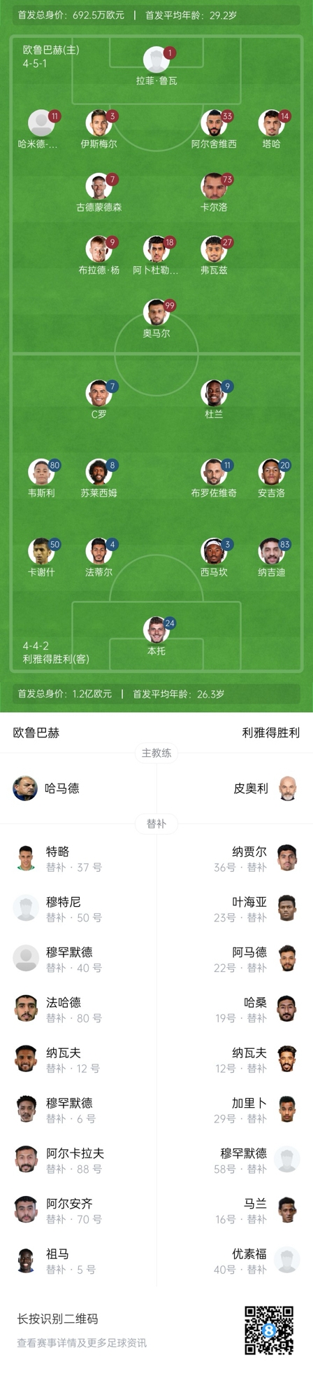利雅得勝利首發(fā):24-本托、3-西馬坎、4-法蒂爾、83-納吉迪、50-卡謝什、11-布羅佐維奇、8-蘇萊西姆、80-韋斯利、20-安杰洛、9-杜蘭、7-C羅