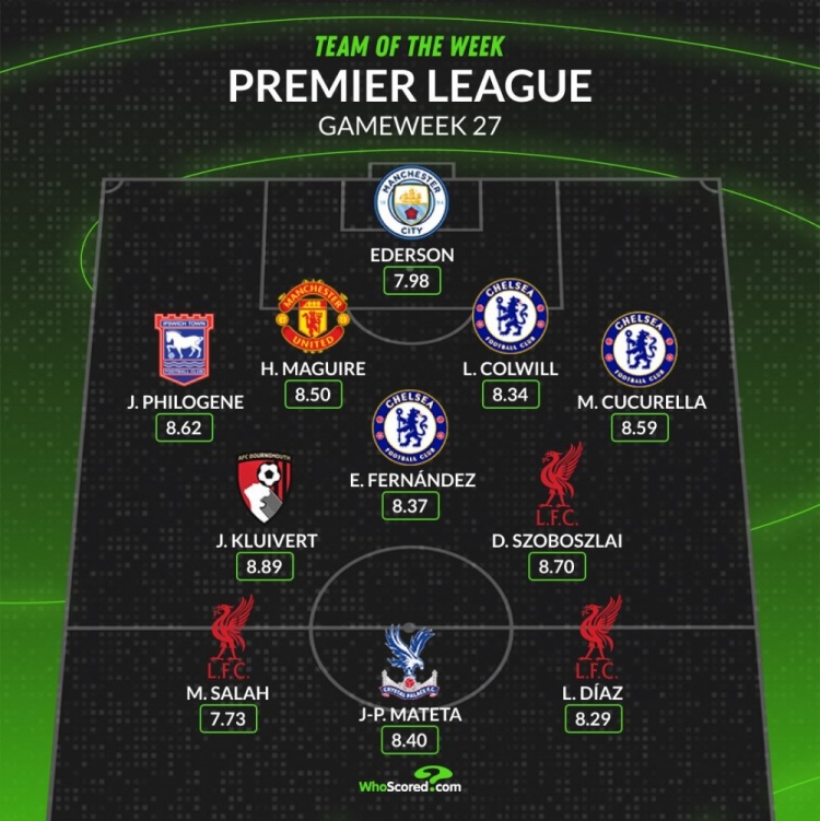 后衛(wèi):菲洛金(伊普斯維奇,8.62分)、馬奎爾(曼聯(lián),8.50分)、科爾維爾(切爾西,8.34分)、庫庫雷利亞(切爾西,8.59分)
