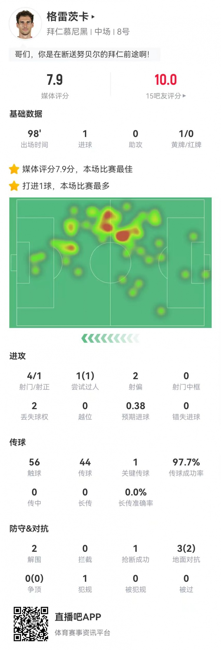 格雷茨卡本場(chǎng)1球+1關(guān)鍵傳球 44傳球43成功 獲評(píng)7.9分全場(chǎng)最高