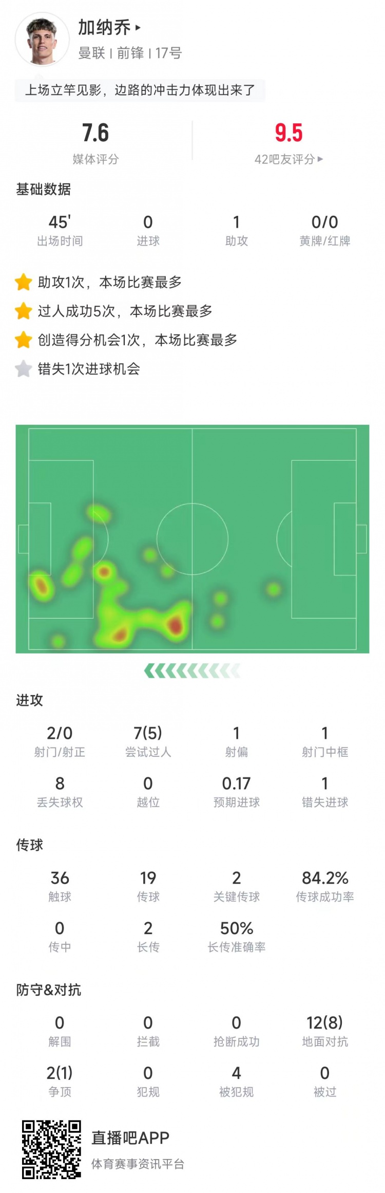 替補(bǔ)送助攻!加納喬數(shù)據(jù):成功過人5次全場最多,2次關(guān)鍵傳球