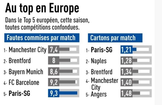 3月1日訊 法國媒體《隊(duì)報》對五大聯(lián)賽本賽季場均犯規(guī)次數(shù)和吃牌數(shù)最少的球隊(duì)進(jìn)行了統(tǒng)計,其中巴黎圣日耳曼在兩項(xiàng)統(tǒng)計中都排在了前五名,具體如下: