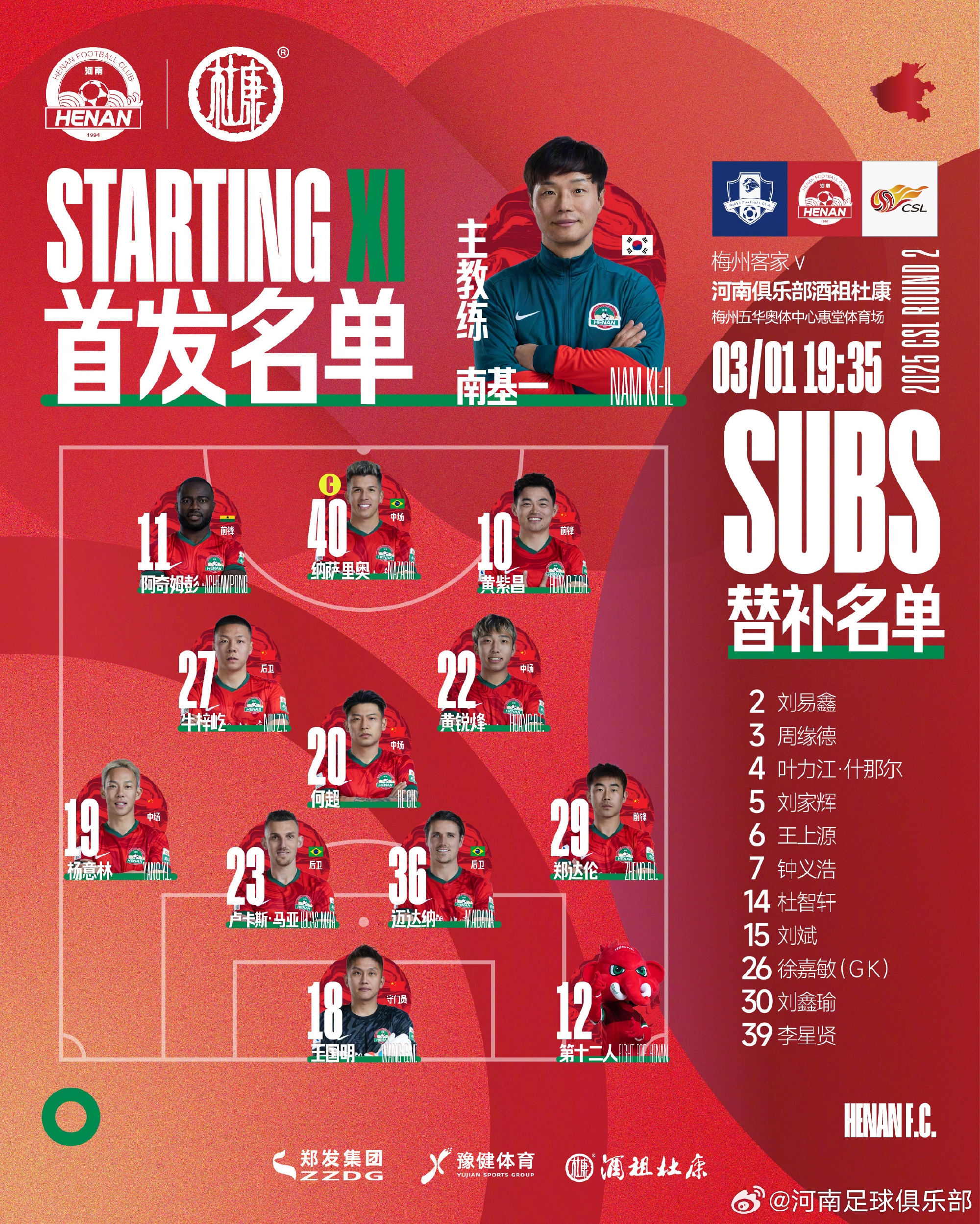 03月01日訊 今晚19點(diǎn)35,中超第2輪河南客戰(zhàn)梅州客家,賽前河南公布首發(fā)名單,外援前鋒卡多索因傷缺席。
