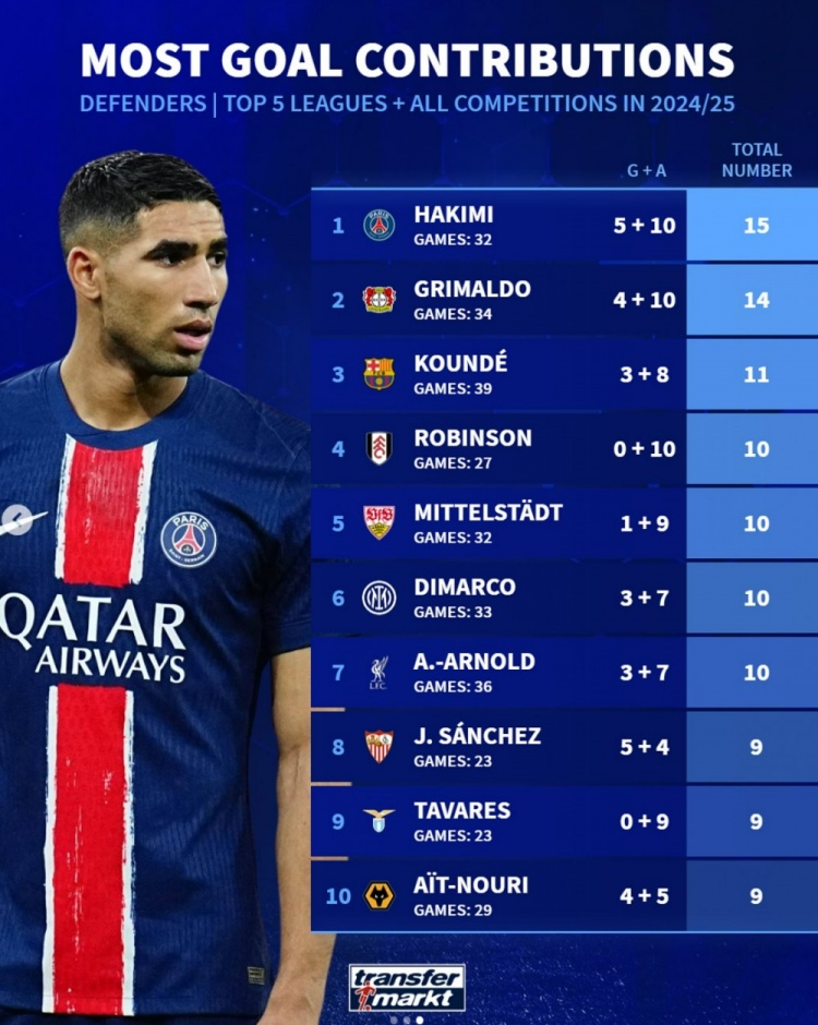 3月1日訊 德轉(zhuǎn)盤點(diǎn)了本賽季五大聯(lián)賽后衛(wèi)球員在各項(xiàng)賽事中參與進(jìn)球榜,其中阿什拉夫居首,孔德、阿諾德等在列,具體榜單如下: