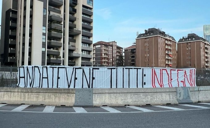 3月1日訊 有米蘭球迷號曬出圖片,部分米蘭球迷在米蘭總部外拉橫幅抗議:離開吧,你們都不配。