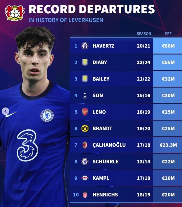 3月2日訊 《轉(zhuǎn)會市場》統(tǒng)計了勒沃庫森隊史賣人最貴榜,哈弗茨以8000萬歐元居首。