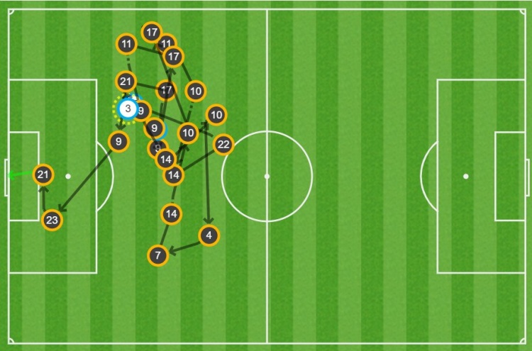 據(jù)統(tǒng)計(jì),這粒進(jìn)球經(jīng)過(guò)了皇馬球員19次連續(xù)傳球后打進(jìn)。在皇馬本賽季西甲所有客場(chǎng)進(jìn)球中,這是皇馬進(jìn)球前傳遞次數(shù)最多的一粒進(jìn)球。