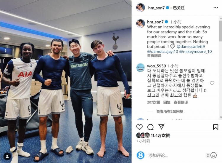 熱刺隊長孫興慜賽后在社交媒體上曬出與三位破門青訓小將的合照,配文:“對于我們的青訓學院和俱樂部來說,這是一個多么特別的夜晚!這么多人的辛勤工作有了成果。對此只有驕傲!”