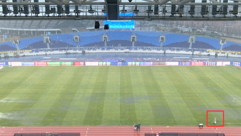 現(xiàn)場雨勢非常大,青島西海岸大學(xué)城體育場工作人員在場邊畫線,剛畫完的線又被雨沖模糊了。