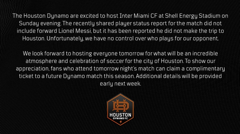 休斯頓迪納摩俱樂部很高興能在周日晚上在主場迎戰(zhàn)邁阿密國際俱樂部。最近的比賽球員狀態(tài)報告中沒有梅西,據(jù)報道稱他沒有前往休斯頓。