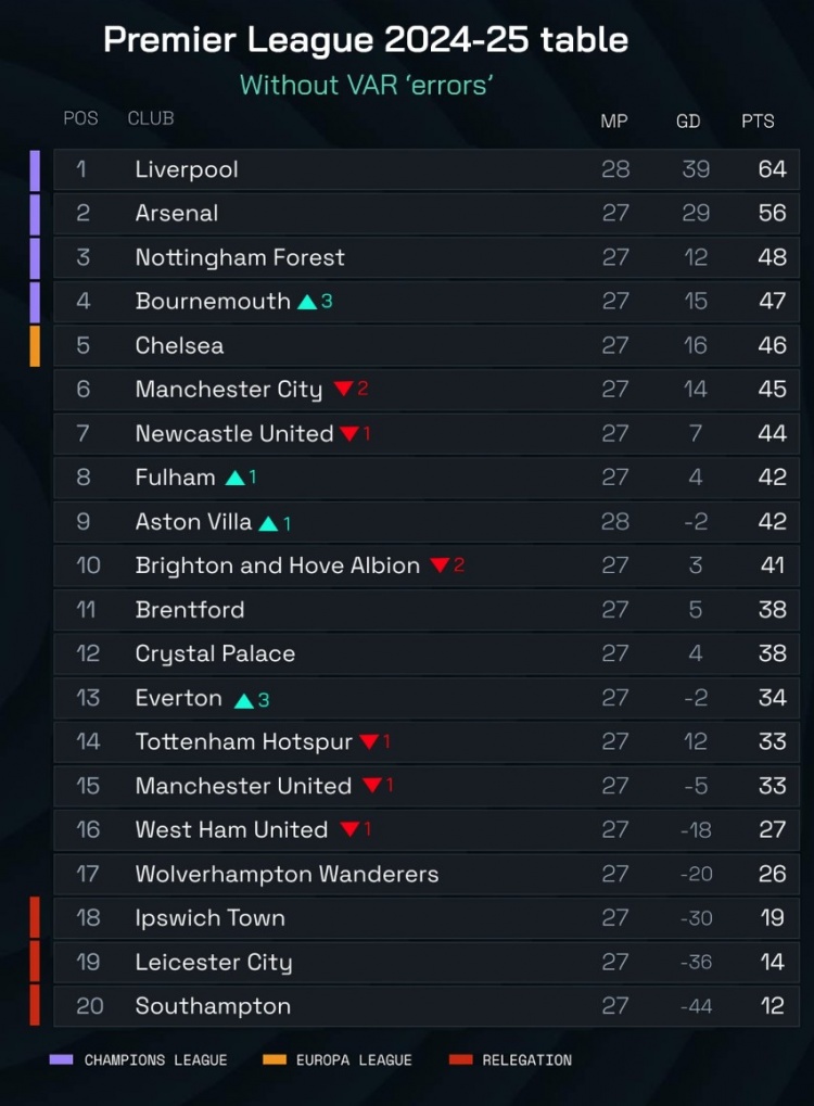 若無(wú)VAR“犯錯(cuò)”英超積分榜:
