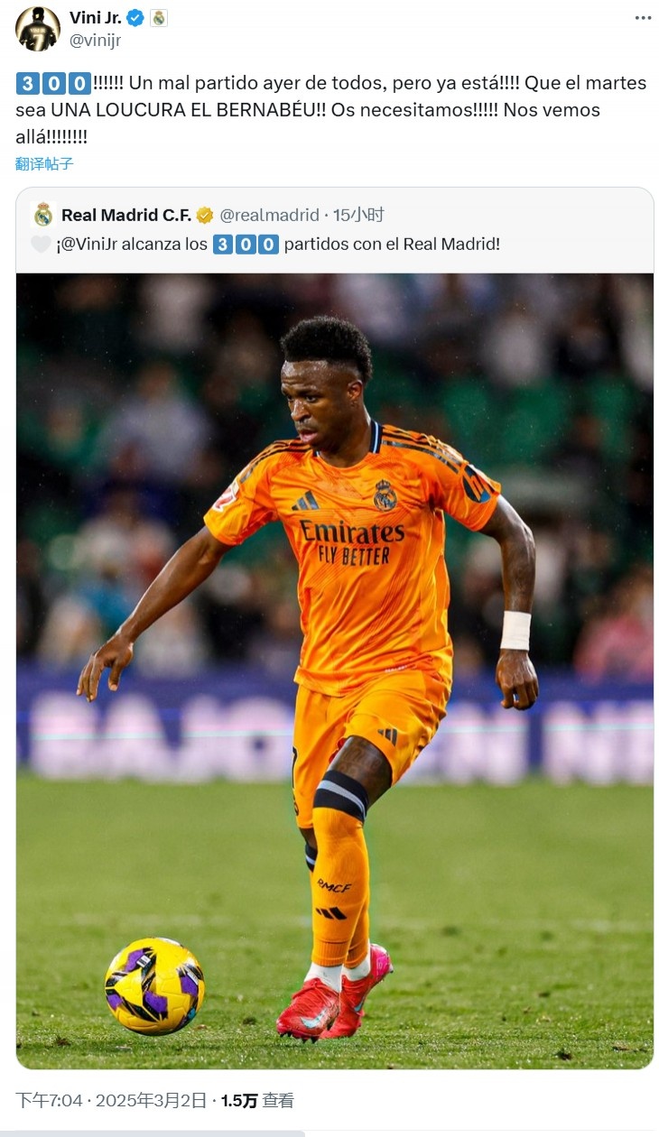 維尼修斯寫道:300稱里程碑!不過昨天是一場糟糕的比賽,可已經(jīng)結(jié)束了?。?!下周二在伯納烏還有一場瘋狂的比賽在等著我們??!我們需要你們的支持?。?!我們到時在那里見?。?!