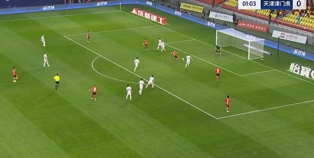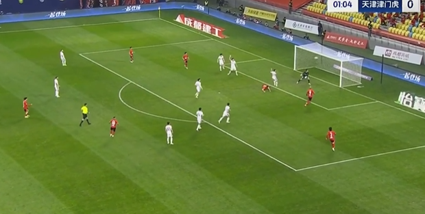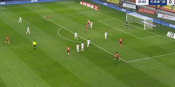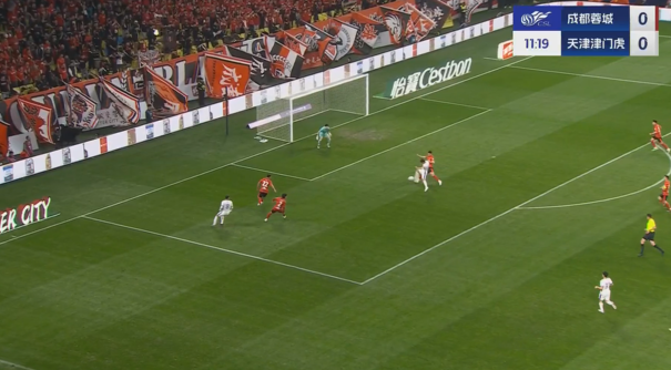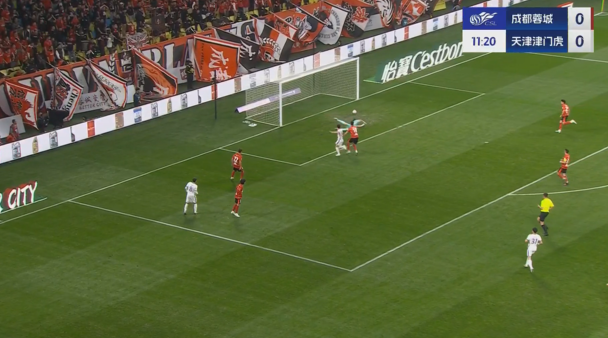 第12分鐘,津門虎后場長傳,哈達(dá)斯禁區(qū)內(nèi)凌空端向中路,王秋明包抄打門得手,津門虎1-0領(lǐng)先蓉城。