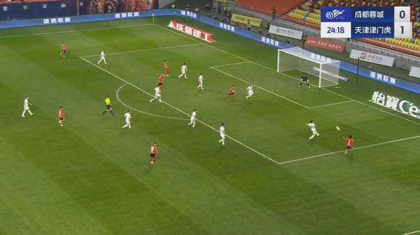 第25分鐘,蓉城扳平比分,胡荷韜右路送出精準(zhǔn)傳中,韋世豪頭球吊射頂入球門遠(yuǎn)角,蓉城1-1津門虎。