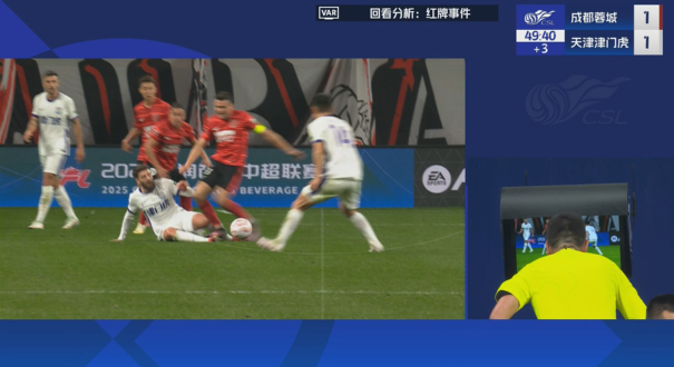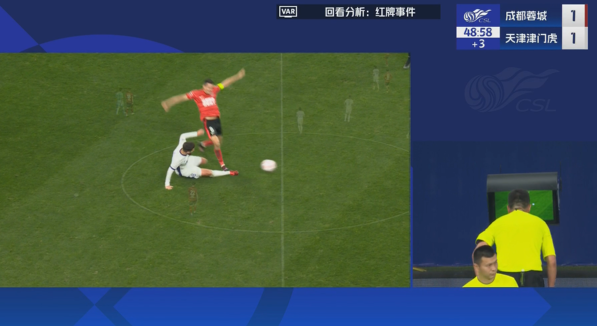 上半場補(bǔ)時(shí)階段,周定洋搶球時(shí)踩到哈達(dá)斯,視頻助理裁判介入,主裁判查看回放后向周定洋出示紅牌。