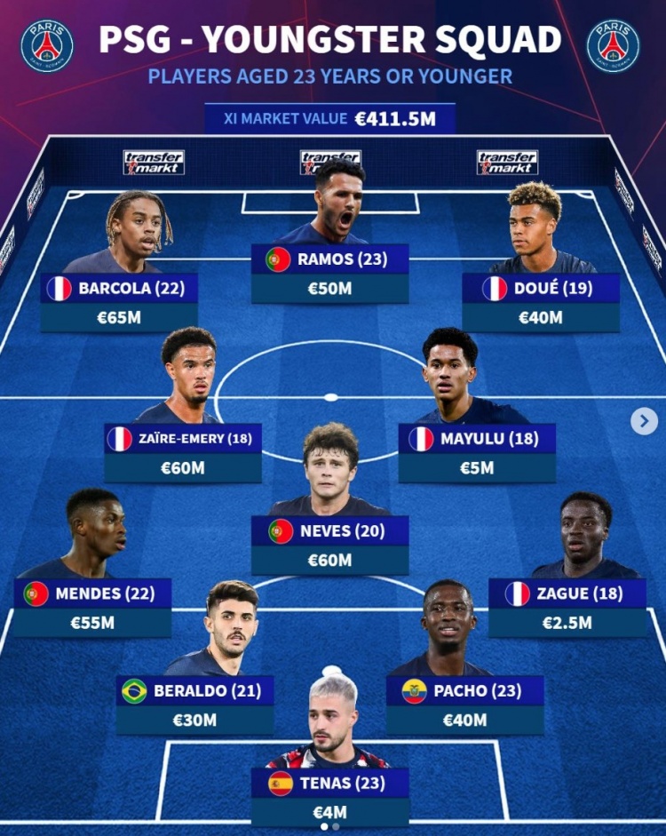 青春風(fēng)暴!德轉(zhuǎn)列巴黎U23陣:總價(jià)4.12億歐,巴爾科拉&內(nèi)維斯領(lǐng)銜