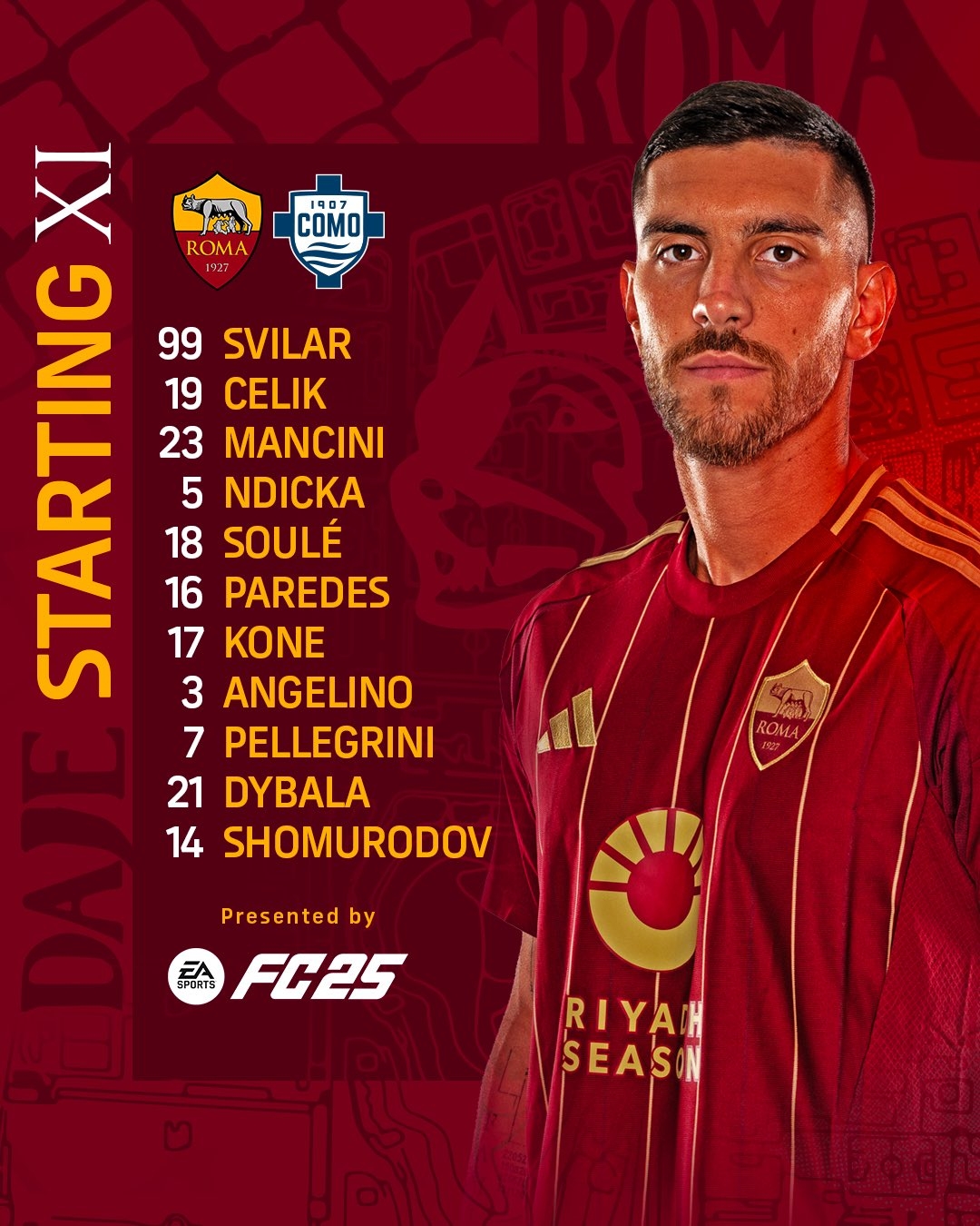 羅馬VS科莫首發(fā):迪巴拉領銜,帕雷德斯、佩萊格里尼、蘇萊出戰(zhàn)
