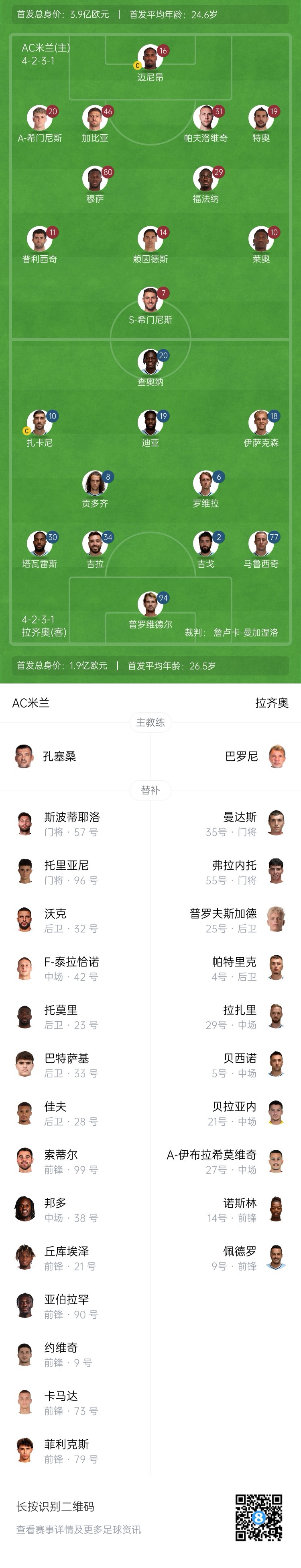 米蘭替補(bǔ):57-斯波蒂耶洛、96-托里亞尼、32-沃克、42-泰拉恰諾、23-托莫里、33-巴特薩基、28-佳夫、99-索蒂爾、38-邦多、21-丘庫(kù)埃澤、90-亞伯拉罕、9-約維奇、73-卡馬達(dá)、79-菲利克斯