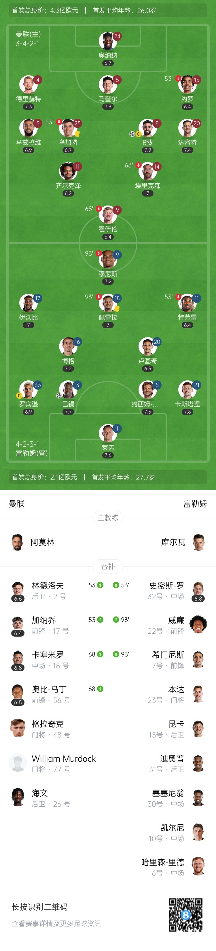 上半場傷停補(bǔ)時1分鐘,半場戰(zhàn)罷,曼聯(lián)暫0-1富勒姆。