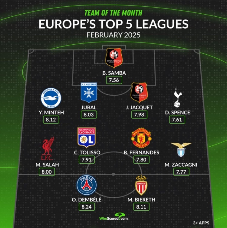 3月3日訊 whoscored統(tǒng)計了五大聯(lián)賽2月評分最佳陣容,登貝萊、薩拉赫、B費領(lǐng)銜。