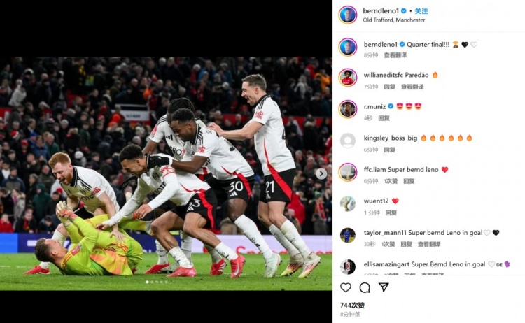萊諾也在賽后通過社媒曬出自己被隊友們簇擁的慶祝照,并配文:“晉級八強戰(zhàn)!”