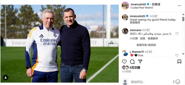 昔日師徒!安切洛蒂社媒曬與舍甫琴科合照:很高興與朋友相見